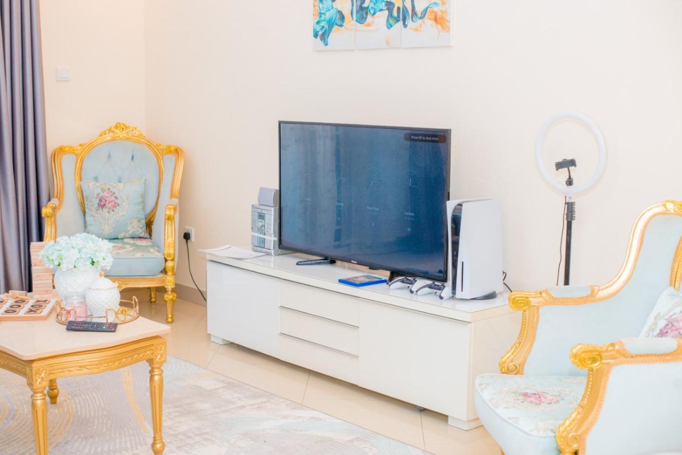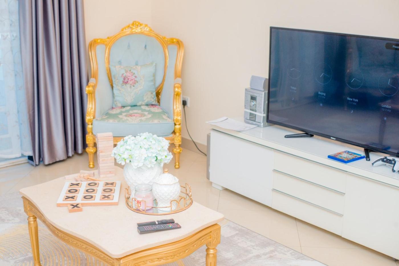 Two-Bedroom Apartment. Boasting a private entrance, this air-conditioned apartment features a kitchen, 2 bedrooms and 3 bathrooms with a bath or a shower and slippers. The fully equipped kitchen features a stovetop, a refrigerator, an oven and a microwave. The apartment has tiled floors, a seating area with a flat-screen TV, a washing machine, soundproof walls as well as city views. The unit has 2 beds.