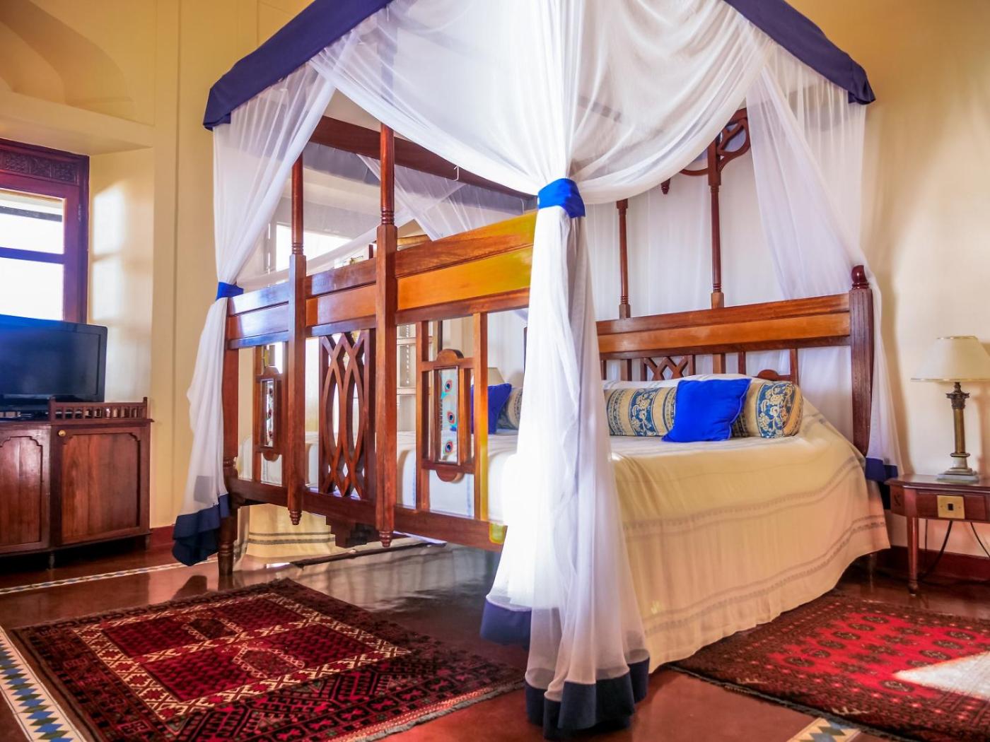 Standard Double Room. Each air-conditioned room is decorated with traditional Swahili-style furnishings and a blue-and-white colour scheme. All are equipped with a satellite TV, minibar, private safe and teacoffee facilities. The private bathroom has a bath and shower. ;
